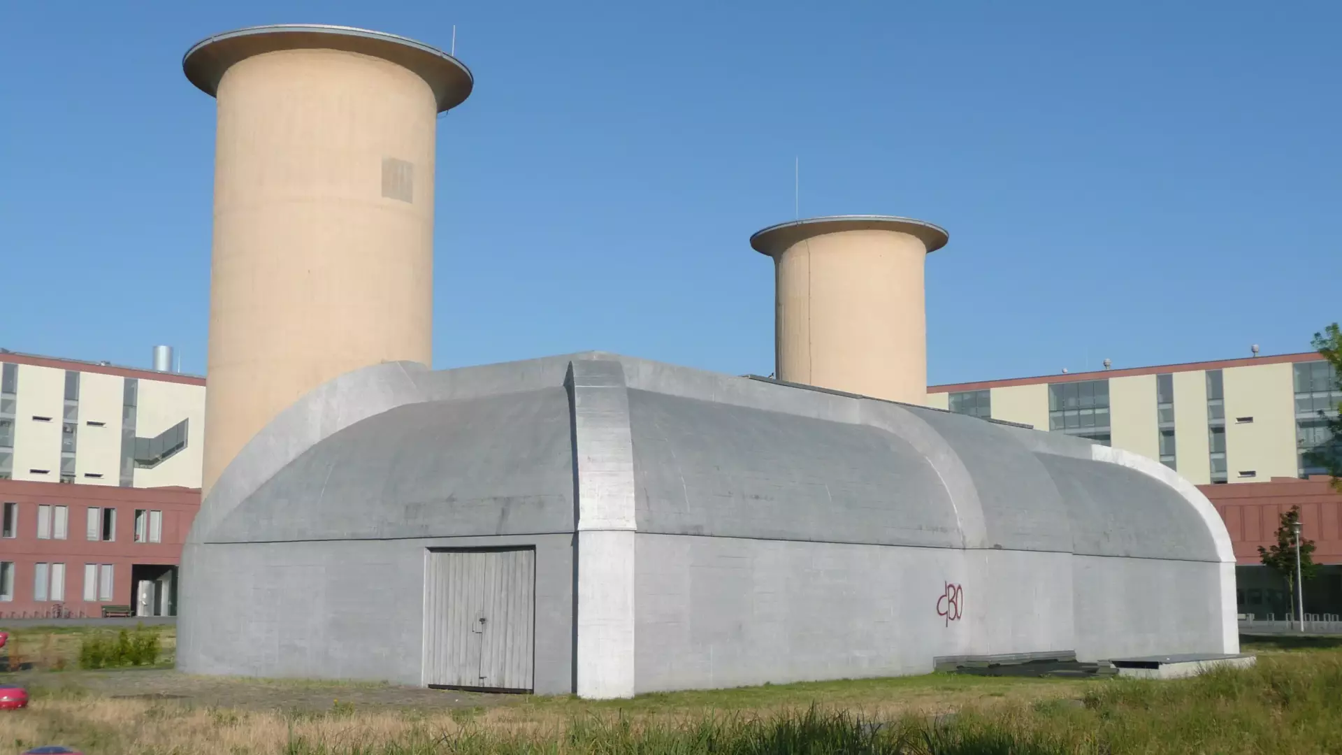 Set about 500 meters from the other structures are the Isothermische Kugellabore, also known as the Adlershofer Busen. Built between 1959 and 1961, these spherical laboratories were dedicated to experiments requiring stable temperatures, supporting research that demanded precise environmental control.