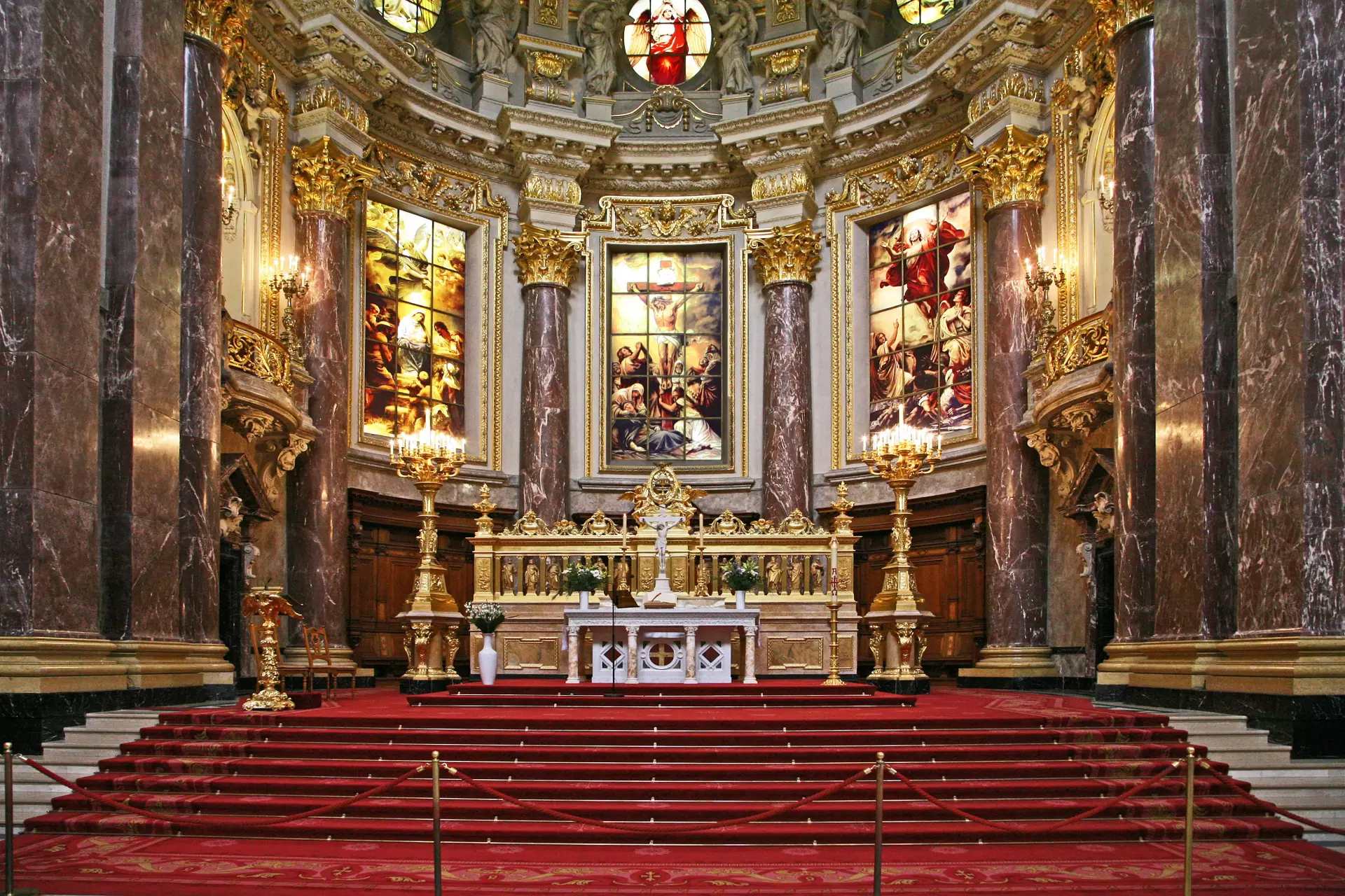 Inside, the cathedral holds the Hohenzollern crypt, the burial place of Prussian kings and their families. Sculpted sarcophagi, quiet chapels, and carefully restored details recall centuries of royal ceremony and state occasions. The nave rises beneath a vast dome lined with mosaics and light, creating a dramatic setting for services and concerts.