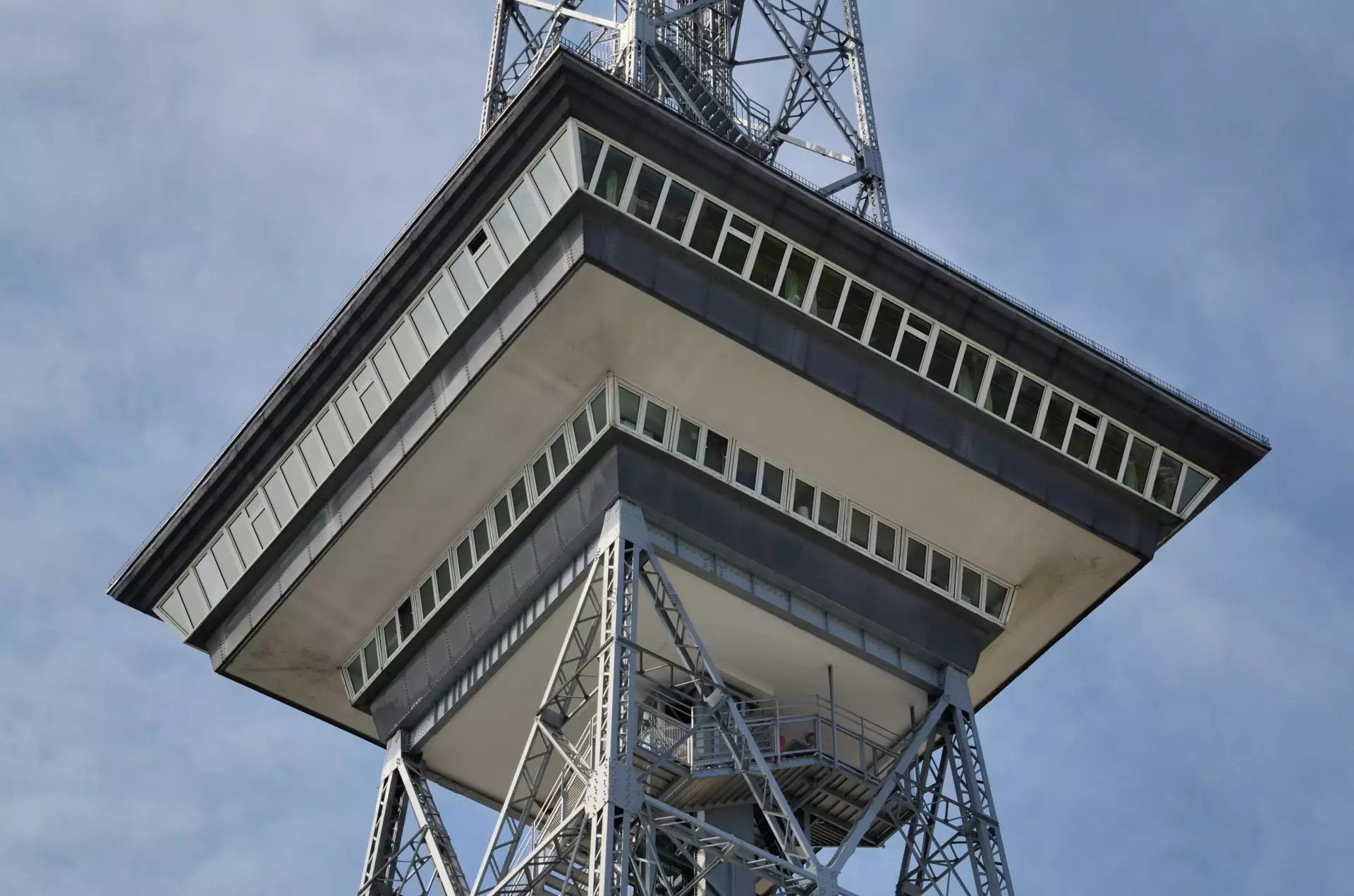 A striking lattice tower rises 150 meters above Berlin, its metal frame tapering to a sharp point against the sky. Built as a broadcast landmark, it offers a classic view of the city’s west side and the surrounding exhibition grounds.