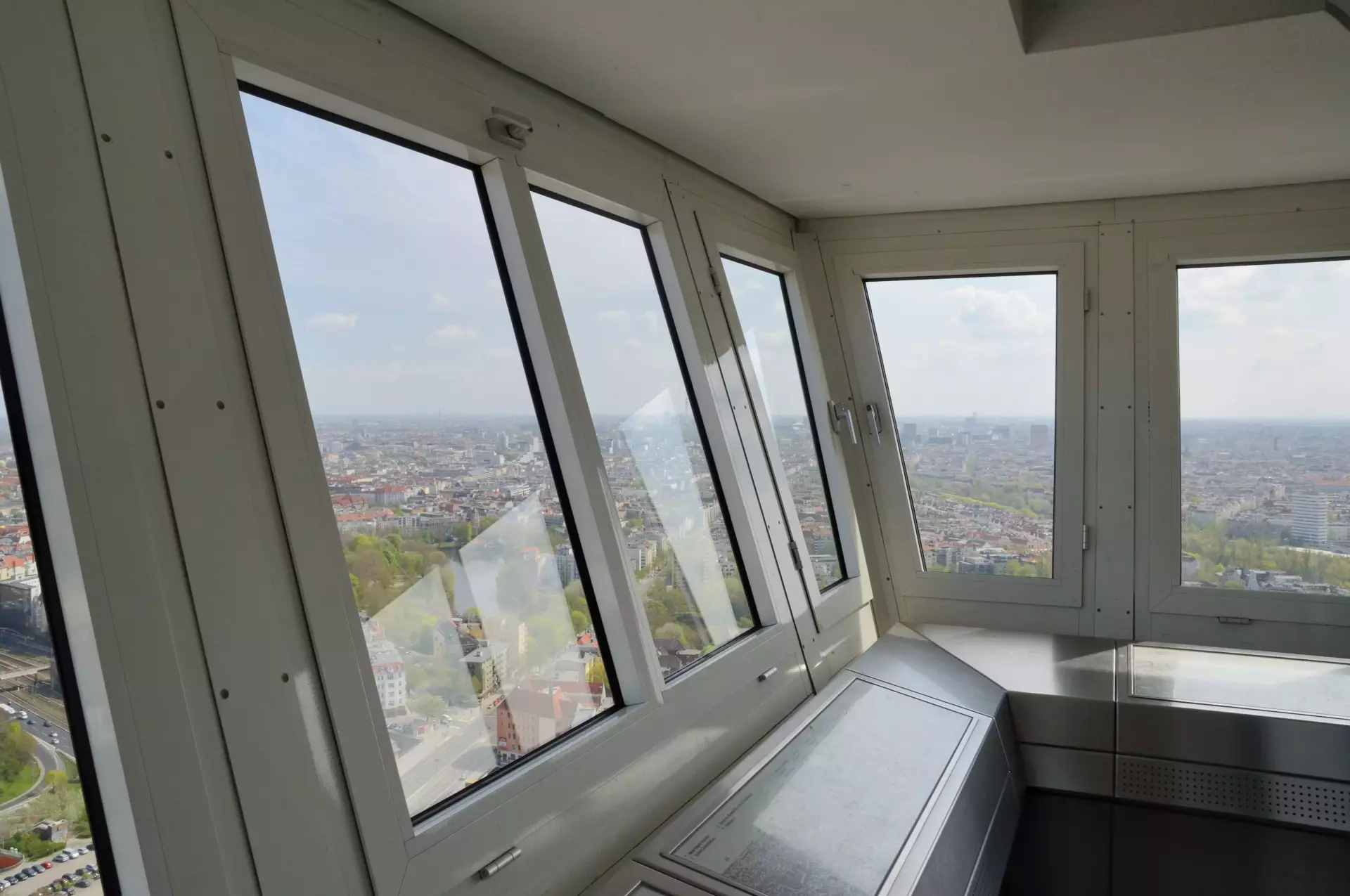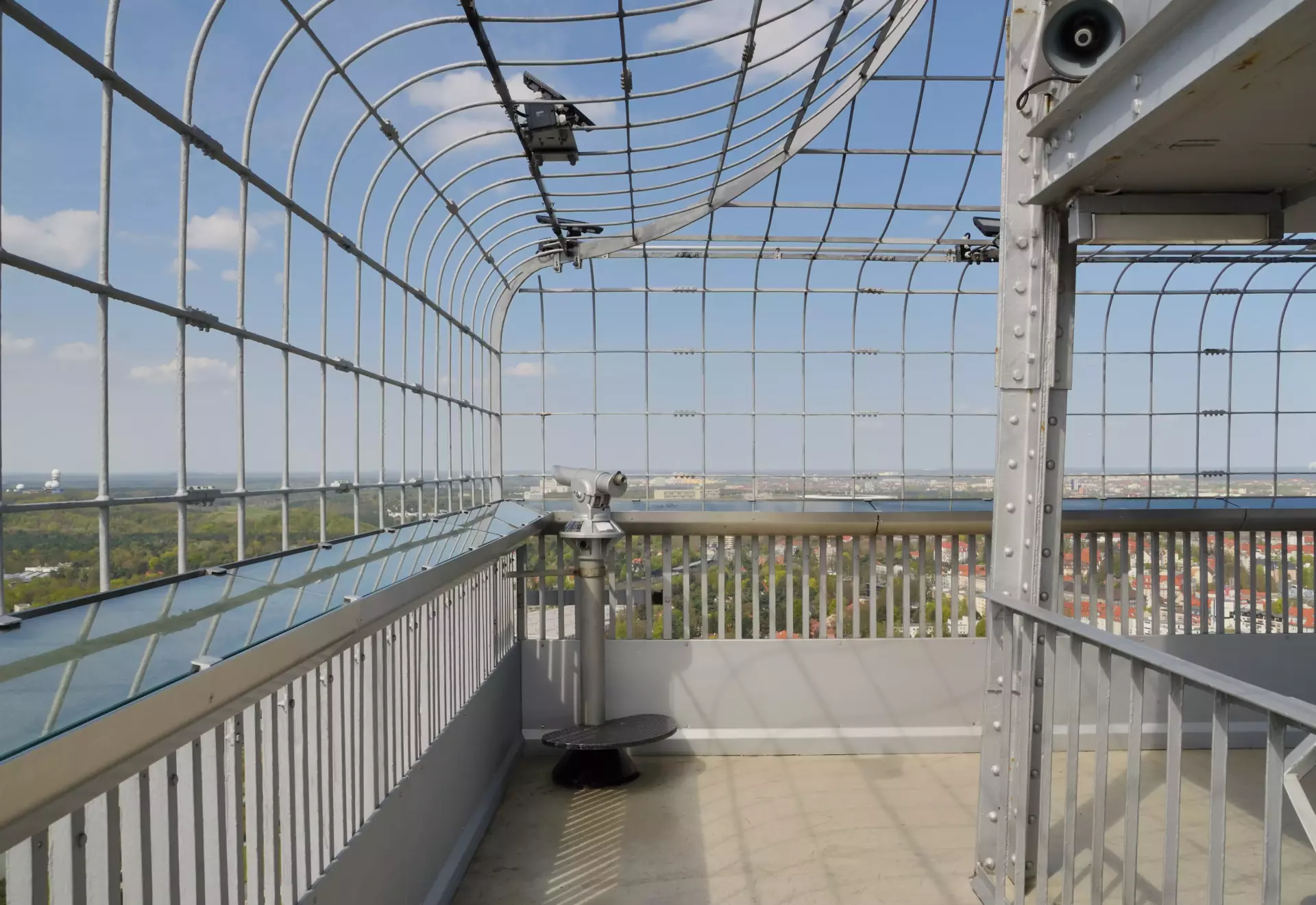 An observation deck sits 124 meters above ground, open to the air and ringed by safety railings. From here, the sweep of rooftops, parks, and thoroughfares spreads out in every direction. The height brings a steady breeze, clearer light, and a sense of space that shifts with the weather—crisp on cold days, hazy in summer.