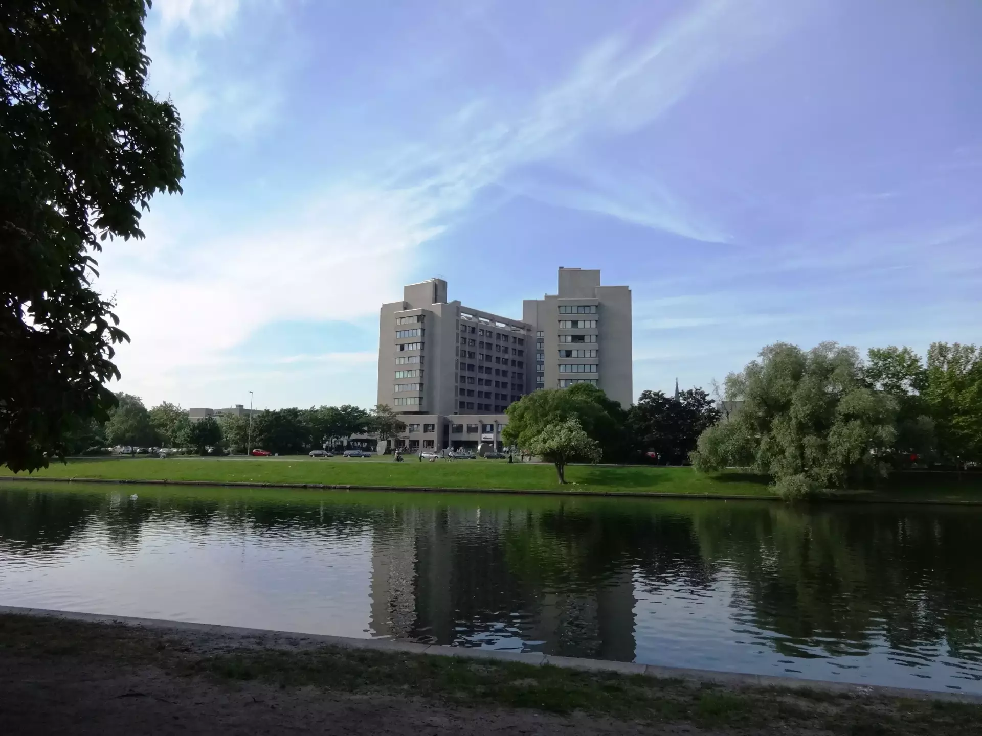In warm months, the canal becomes lively. People spread out on the grass, boats glide past, and the tree-lined edges turn into a social scene. Sections of the waterfront are dotted with bars and restaurants, many with terraces that open right onto the promenade.