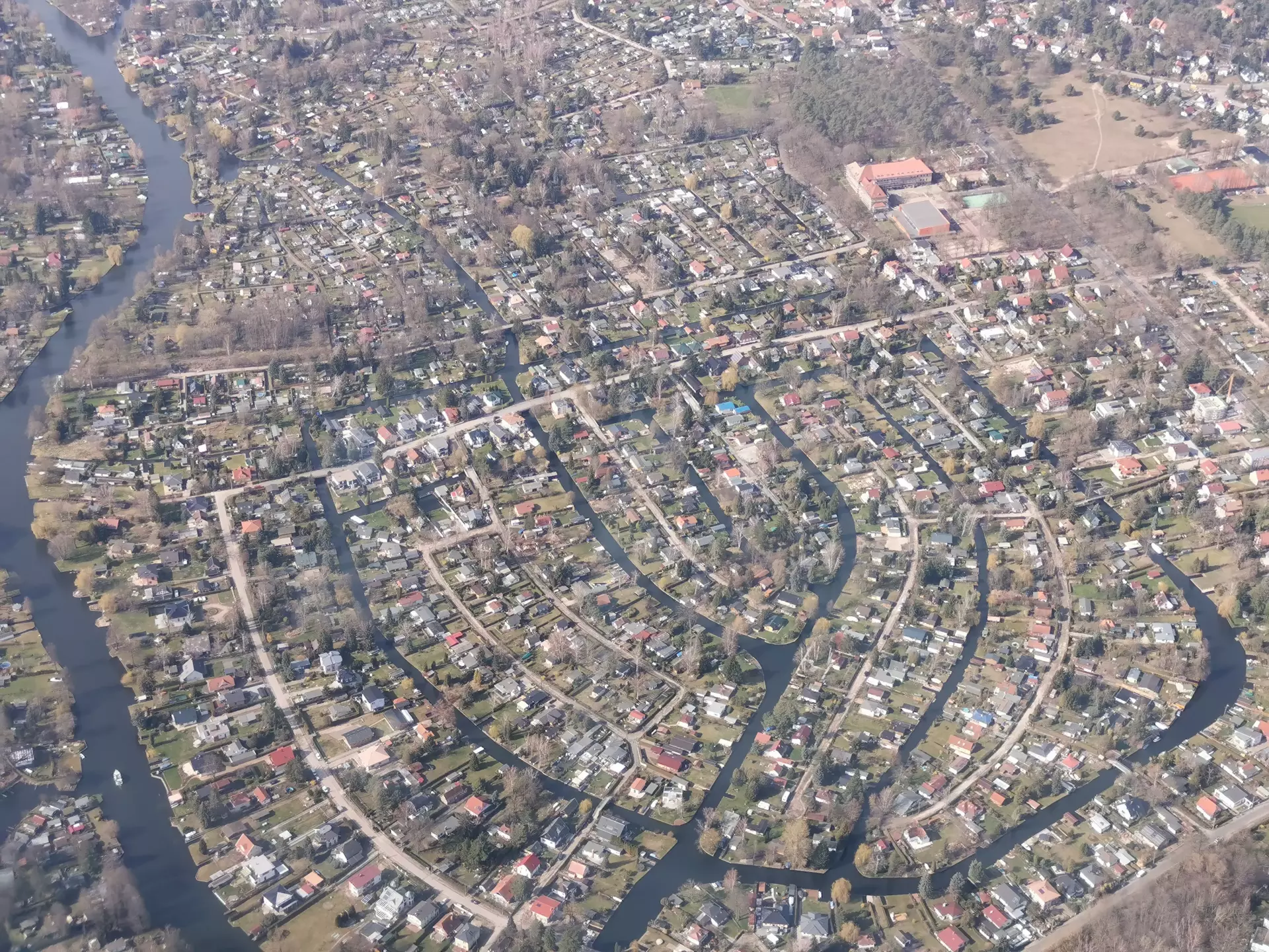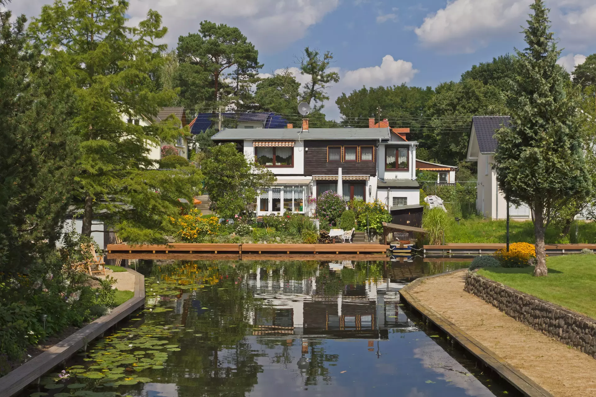 A waterside landscape unfolds with calm canals, bright reeds, and trees reflected like brushstrokes on a mirror. Small boats drift past wooden docks, and footbridges link quiet banks where dragonflies skim the surface. The air carries a light, briny scent, and the soft ripple of water sets an easy rhythm to the day.