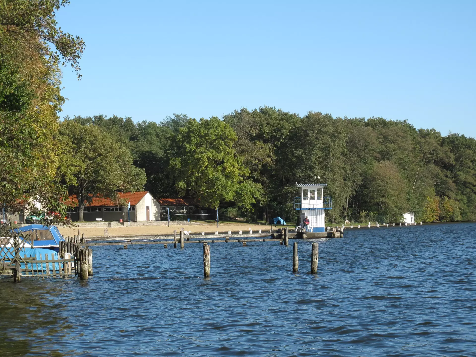 Seebad Wendenschloss spreads along the shore of Langer See, a public lakeside lido that first opened in 1915. The sandy beach slopes gently into clear water, creating a relaxed scene of swimmers, sunbathers, and passing sailboats. From the shoreline, the view stretches across the lake to the historic regatta course on the opposite bank, where sleek racing shells often glide by.