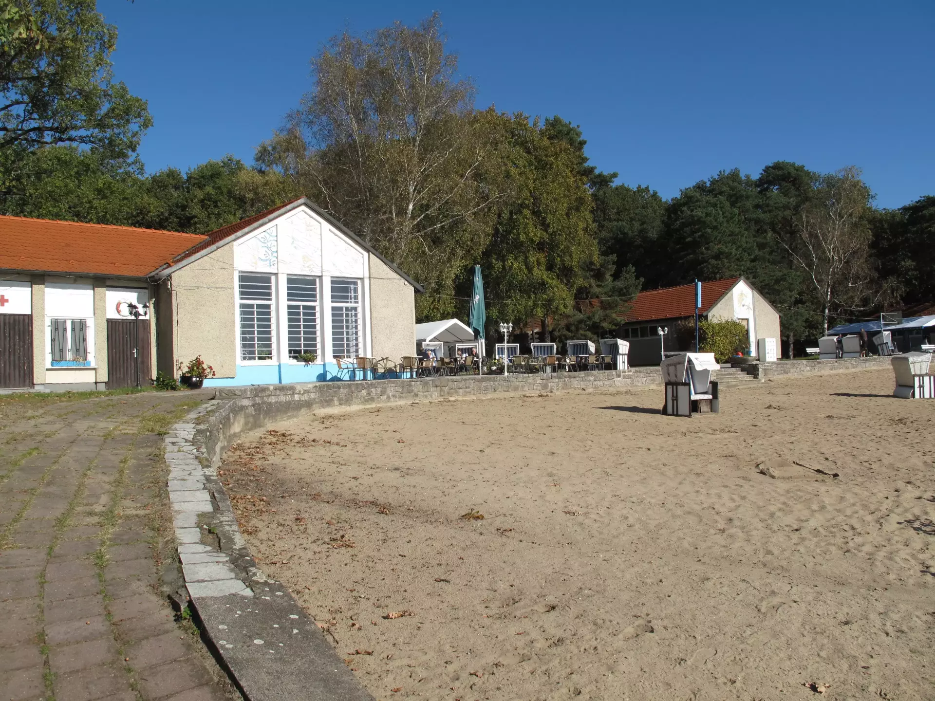 Opened in 1915, the lido reflects more than a century of Berlin’s waterside leisure. Wooden piers and simple changing areas recall an earlier era, while updated facilities keep the focus on comfort and easy access. The long perspective across Langer See links past and present as rowers and paddlers trace the regatta line that has drawn spectators for generations.