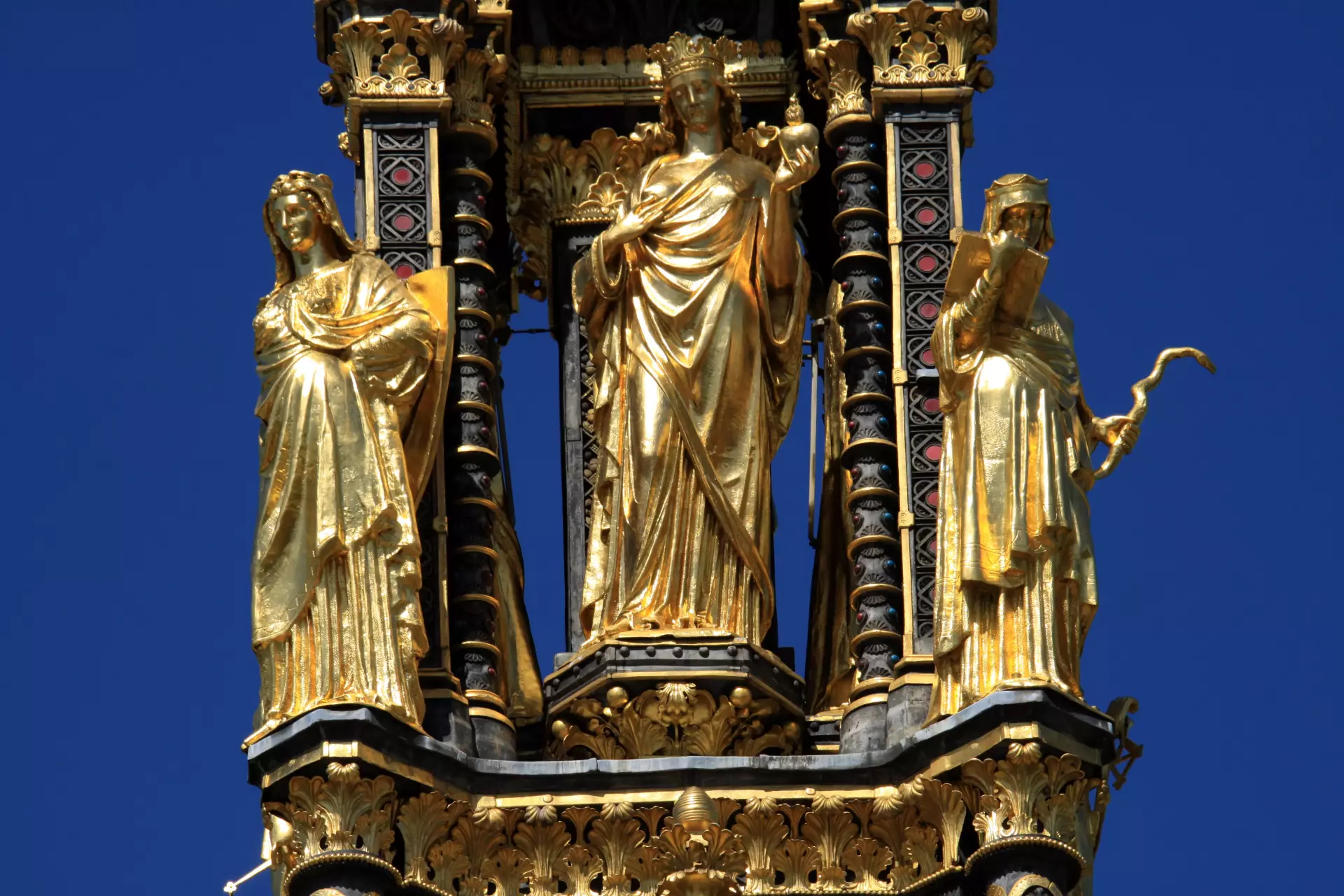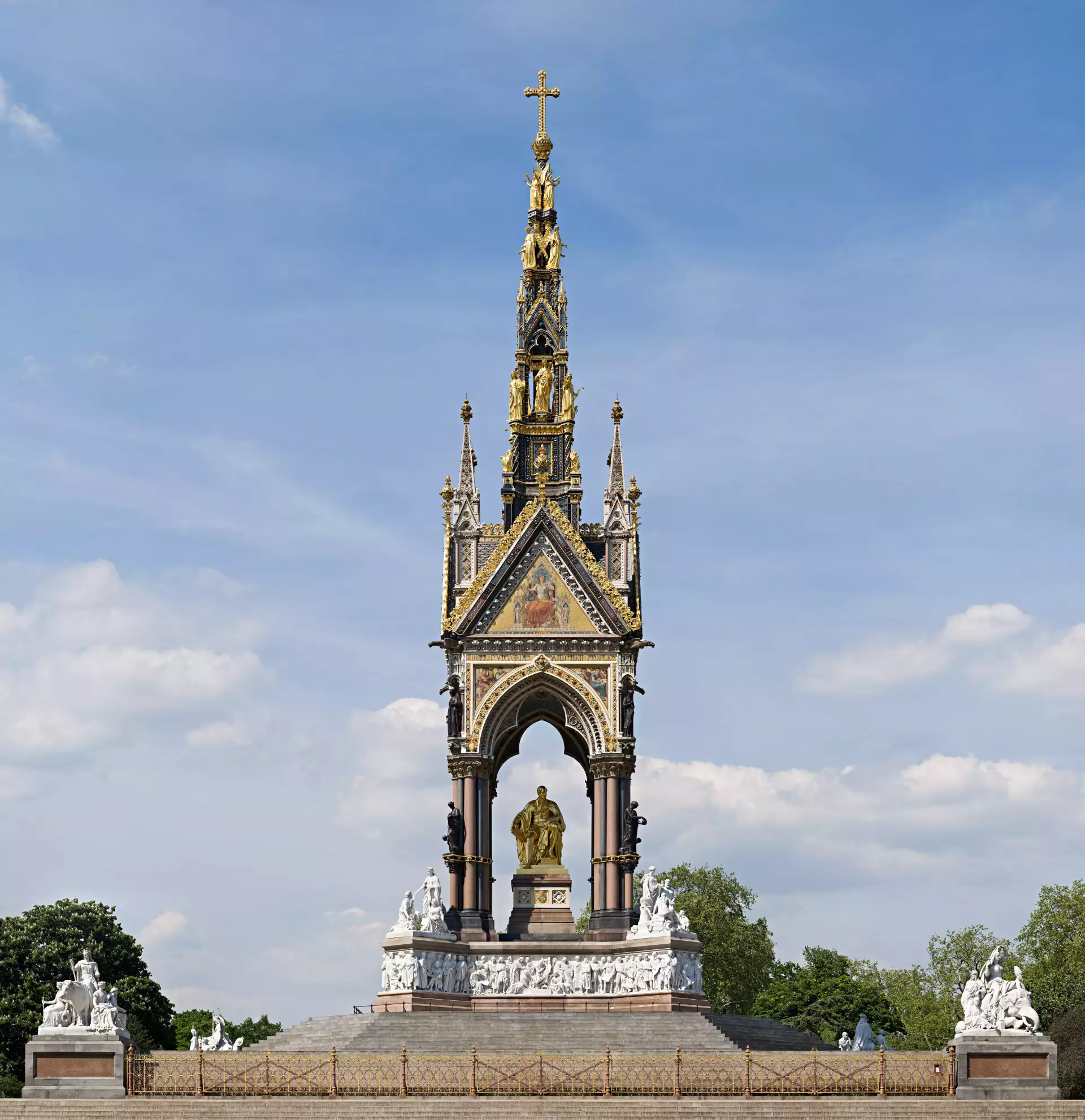 The Albert Memorial stands as a highly detailed Gothic-style monument, dedicated to the memory of Prince Albert, the beloved husband of Queen Victoria. It is a stunning example of Victorian architecture, showcasing intricate designs and craftsmanship.