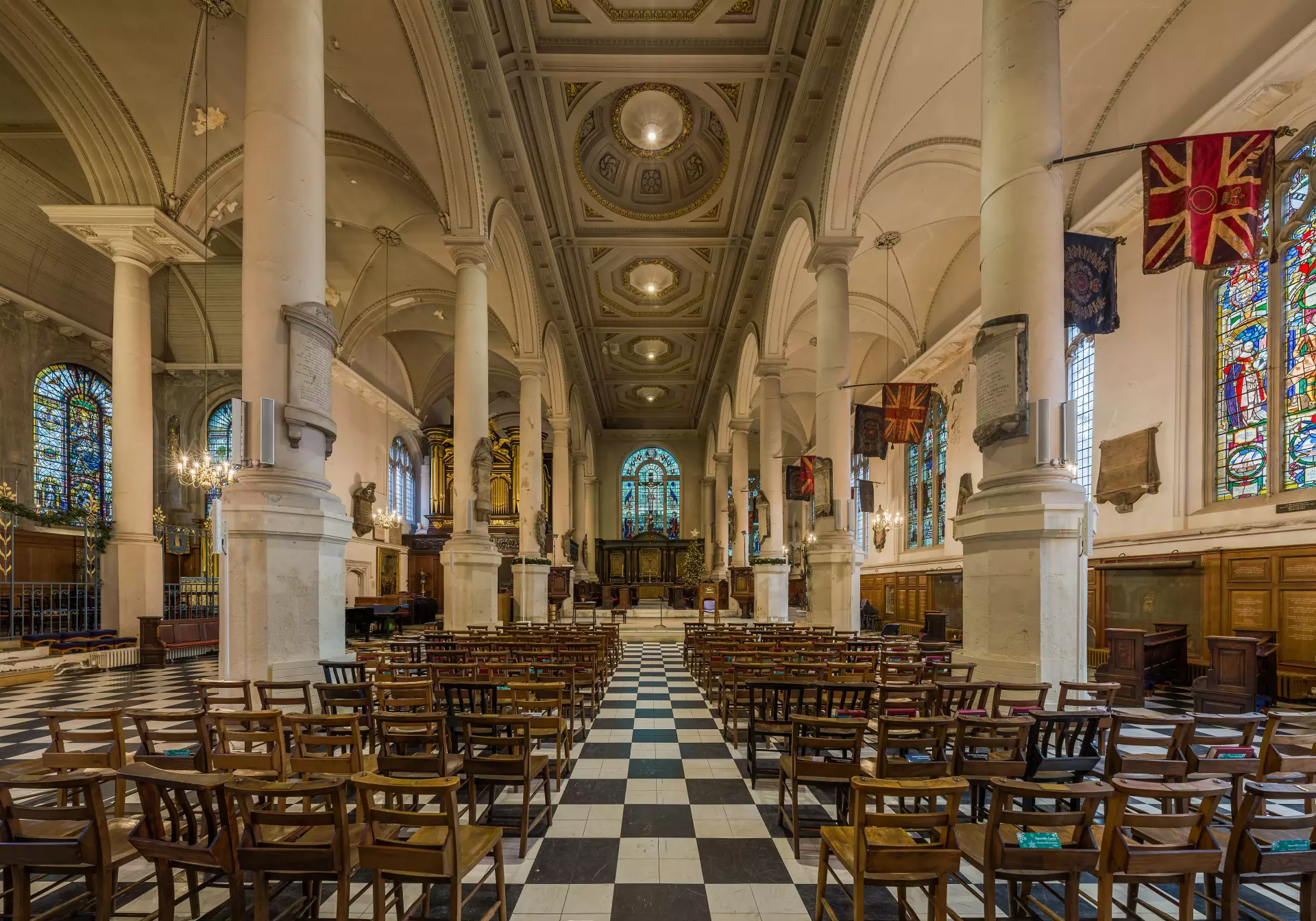 Constructed 1672-9 to a design by Sir Christopher Wren and regarded as one of the finest Wren churches. The 63 feet (19 m) high dome is based on Wren's original design for St Paul's Cathedral. The circular altar is by the British sculptor Henry Moore, and the kneelers are designed by Patrick Heron. Free lunchtime concerts at 1PM on Tuesdays (except August). Free Organ recitals at 12:30PM on Fridays. Occasional art exhibitions on Christian themes and other events.