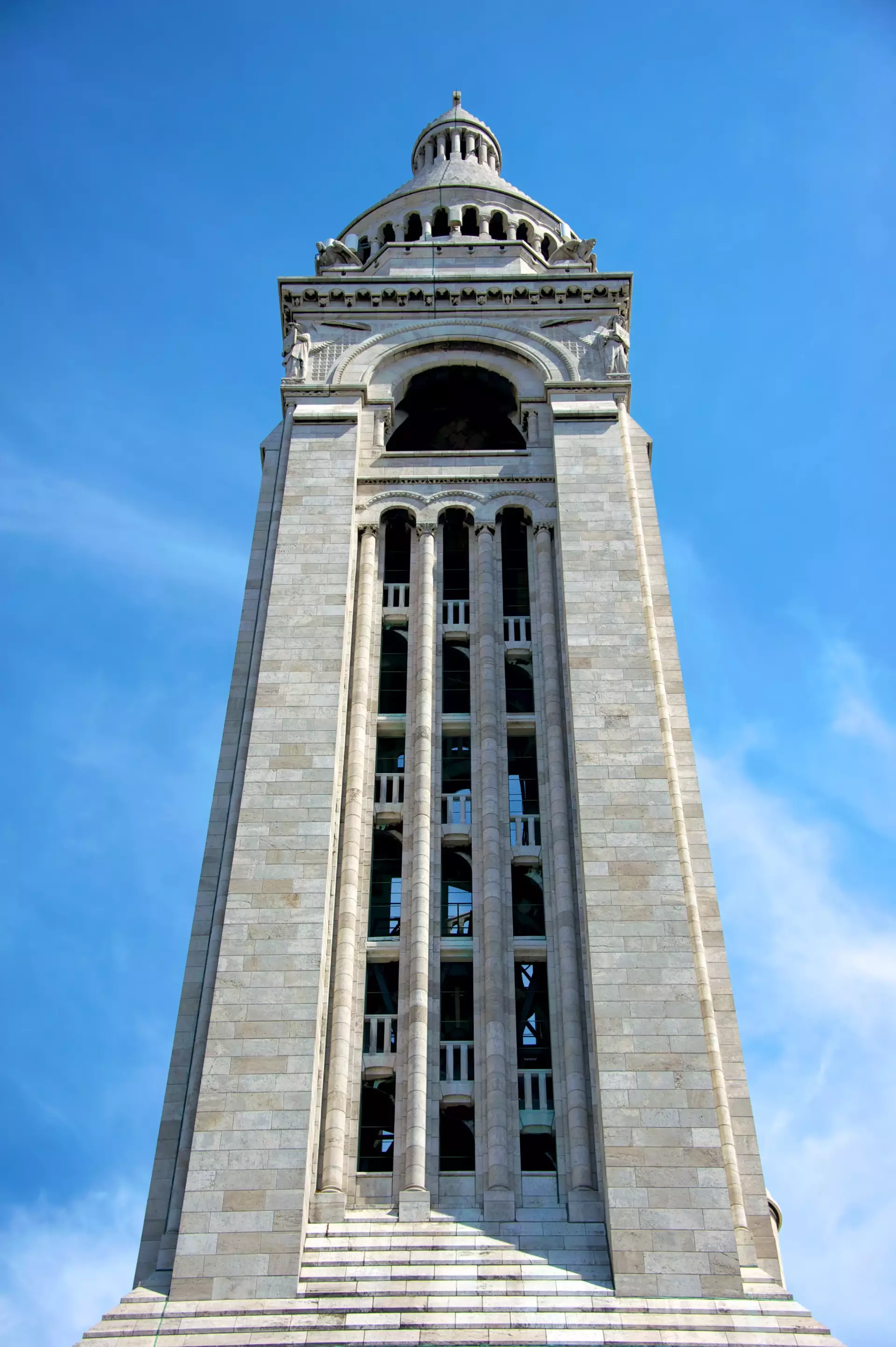 The Sacré-Cœur, a brilliant white church, stands high above the northern part of Paris. Its white towers and onion-shaped dome, rising 83 meters into the sky, are visible from many places across the city. Construction began in 1875 and continued until 1914. The site was chosen because it was the birthplace of La Commune, and the church was officially built as an act of repentance for the violence during the civil war. Thousands of Communards were executed here, and the church also serves as a memorial for those lost in the Franco-Prussian War of 1870. Wealthy businessmen funded the project, and several architects worked together to design the church's unique Romano-Byzantine style. Sacré-Cœur was finally consecrated in 1919.