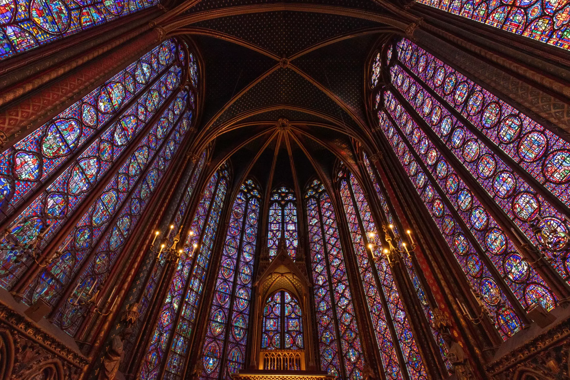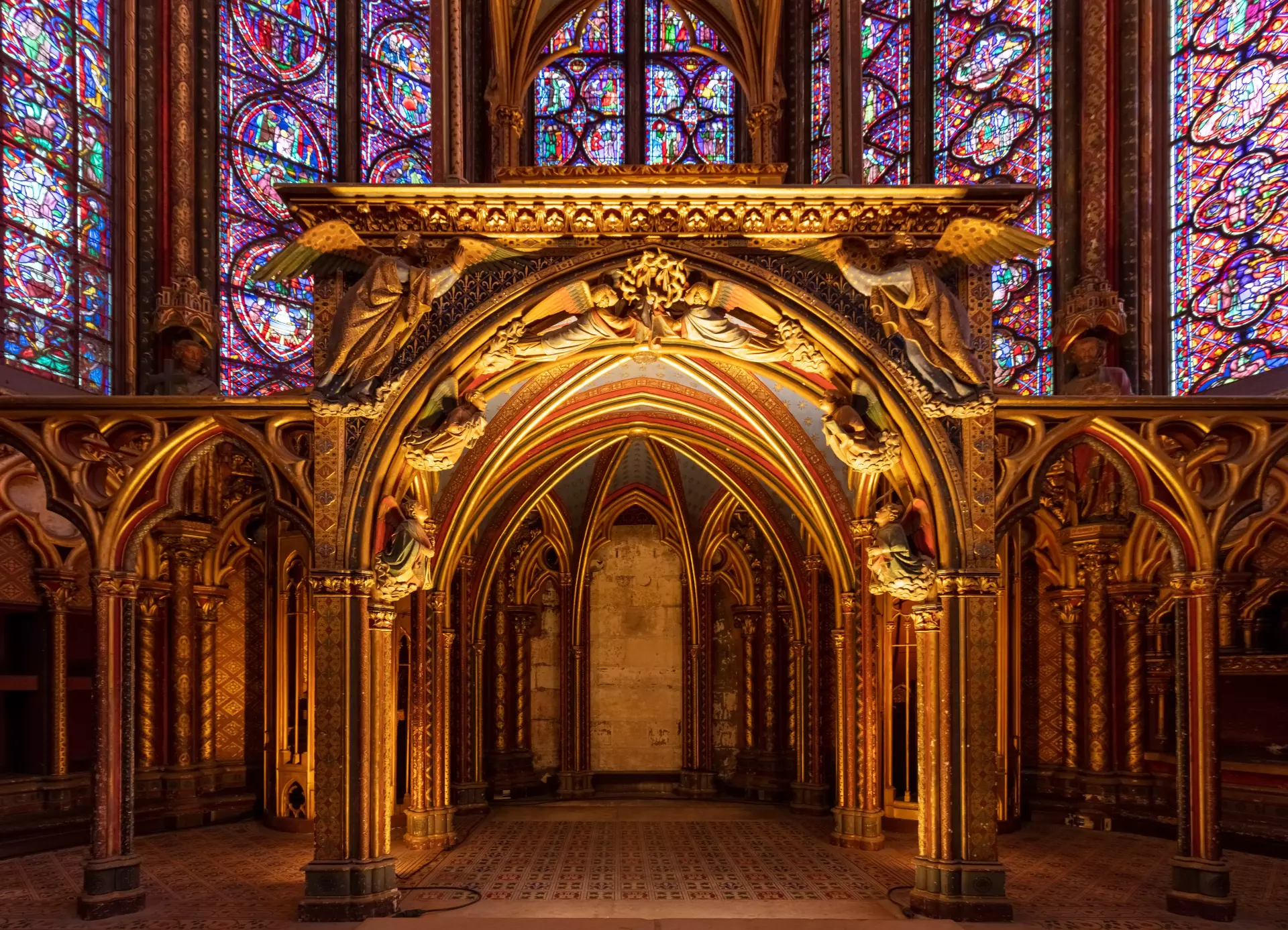 The stained glass windows are the main attraction of Sainte-Chapelle. On a sunny day, the glass panels glow with deep reds, blues, and purples, creating a breathtaking scene inside the small chapel. The light not only fills the air but also highlights the dramatic colors on the tiled floor, making the entire space feel magical.