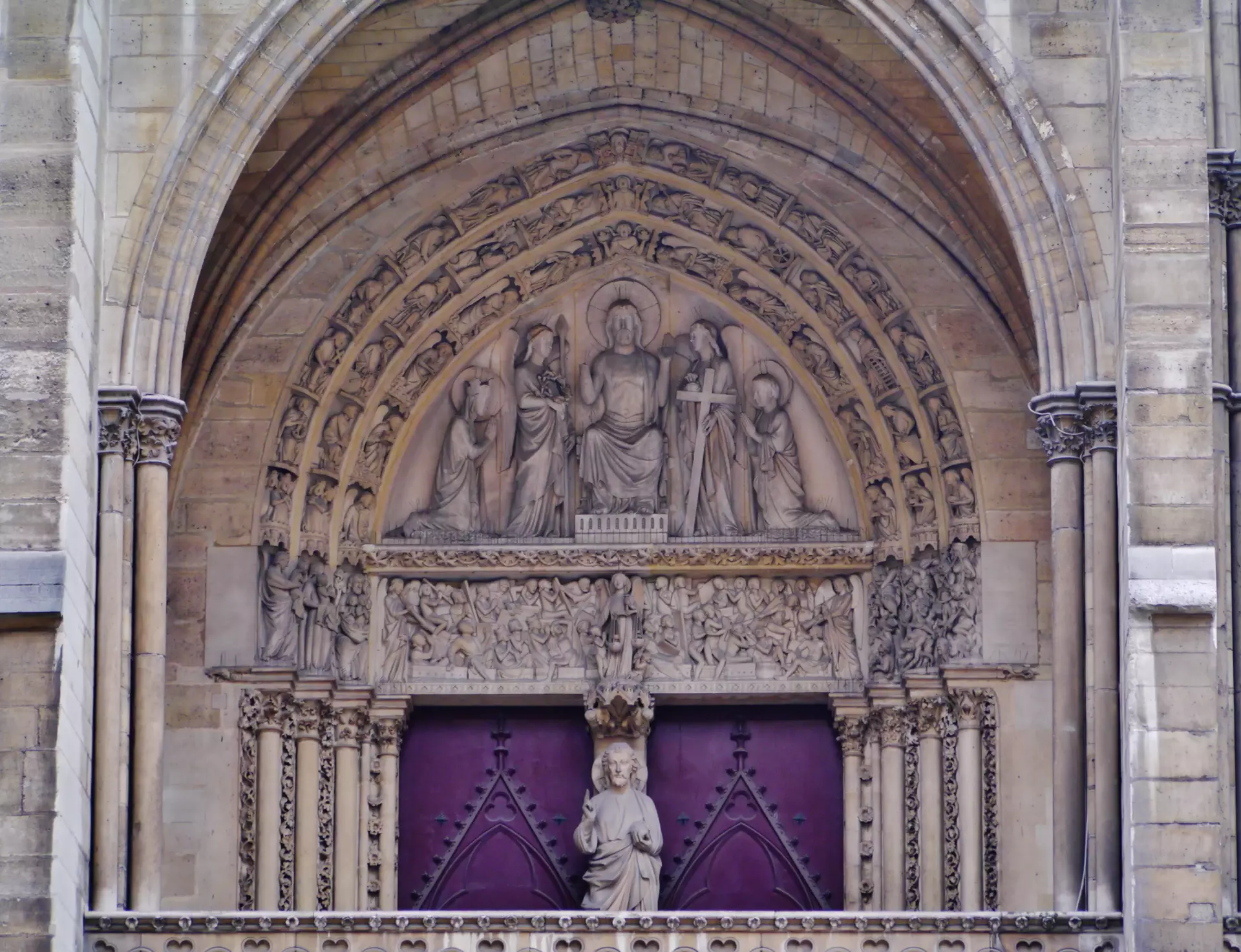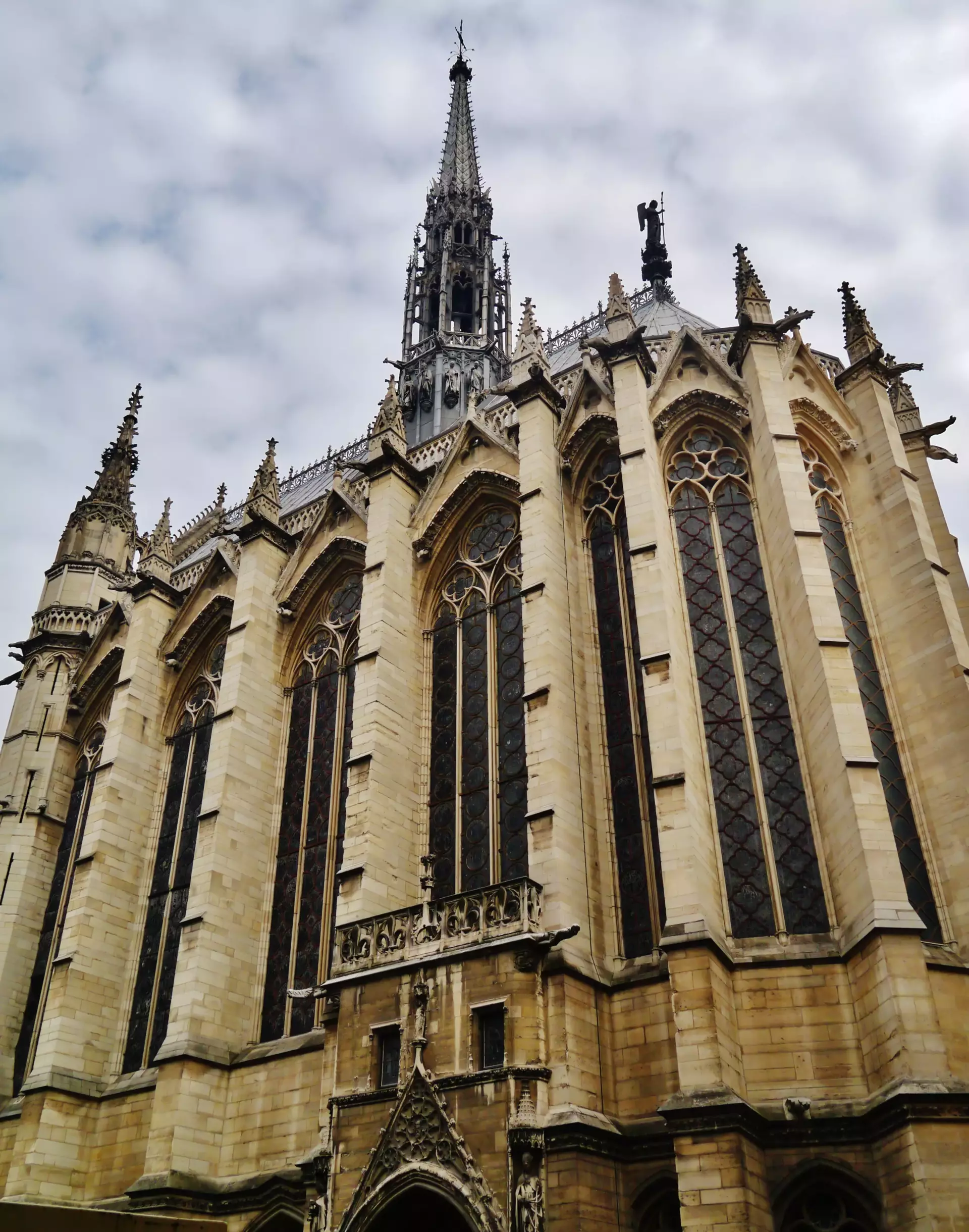 Sainte-Chapelle is located inside the Courts of Justice, so all visitors have to pass through a security check before entering. The experience inside depends a lot on the weather. On cloudy or rainy days, the famous light show from the windows is less dramatic, but on sunny days, the chapel comes alive with color.