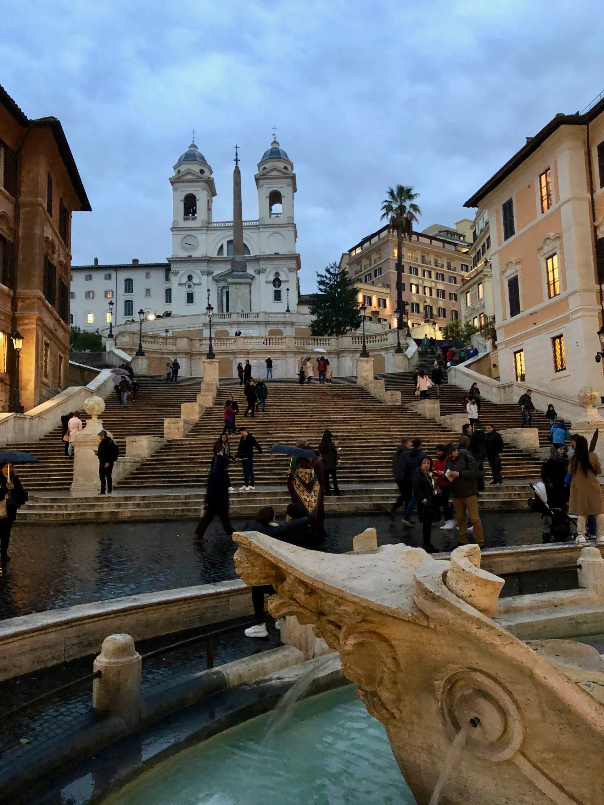 In the center of the square sits the Fontana della Barcaccia, or Old Boat Fountain. Created between 1627 and 1629 by Pietro Bernini and his son, Gian Lorenzo Bernini, the fountain is a tribute to Rome’s history with the Tiber River. Long before flood barriers protected the city, the Tiber often overflowed, and on one occasion, a boat landed in the square after the floodwaters receded. This event is depicted in the fountain’s unusual shape. Its decorations reflect the coat of arms of Pope Urban VIII Barberini, who ordered its construction during his papacy.
