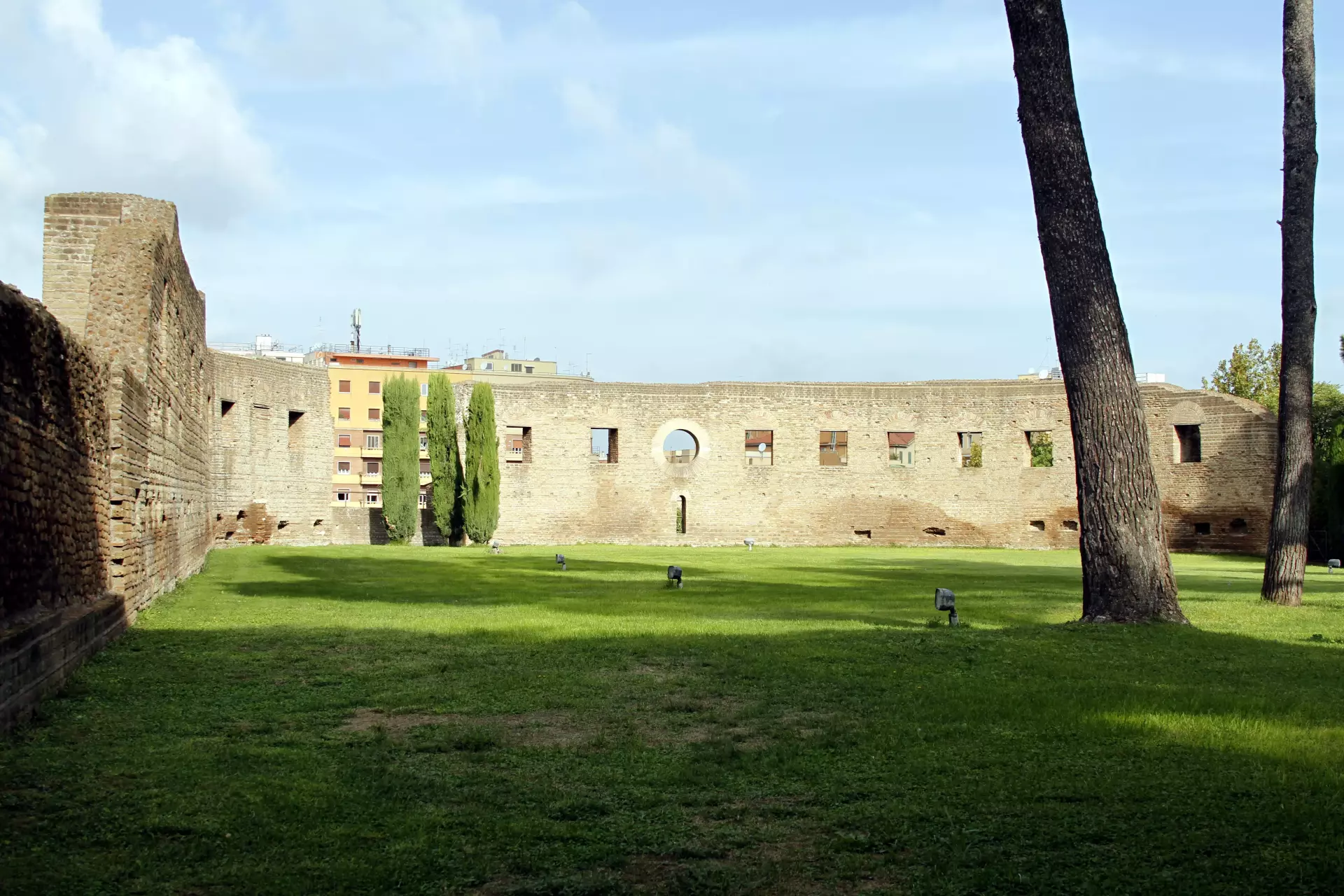 This is a large tomb built by the Roman Emperor Augustus in 28 BC in the form of a stone ring covered by an earth mound. A brick wall, 87 m in diameter, carried an earth mound covered with cypresses. On top of the hill stood a bronze monument of the emperor. The building was 44 meters high. At the beginning of the alley, which led to the tomb were two Egyptian obelisks. On both sides of the doorway bronze plates describe the "Res gestae", the deeds of the emperor. The urns of Augustus, Marcellus, Octavia, Agrippa, Drusus and other members of the Julian Claudian dynasty were revered here. In the Middles Ages the building served as citadel of the Colonna family. It was destroyed by Pope Gregor IX in 1241. The body of Cola di Rienzo. a popular leader of the people in the mid-14th century, was burnt in this monument. The Mausoleo di Augusto is not open to the public, and is fenced off.